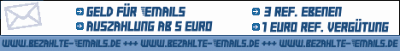 Wir versenden bezahlte Emails an unsere Mitglieder. Diese werden dann bestätigt und das Mitglied bekommt Punkte auf sein Konto gutgeschrieben. Die Punkte werden am ersten des Monats in Euro umgerechnet und den Mitgliedern gutgeschrieben. Unsere Leistungen:kostenlose und jederzeit kündbare Mitgliedschaft! Auszahlung bereits ab 2,5 Euro! Neue Mitglieder Werben über 5 Ebenen (15%,8%,4%,2%,1%)! HTML- oder Text-Mails!
